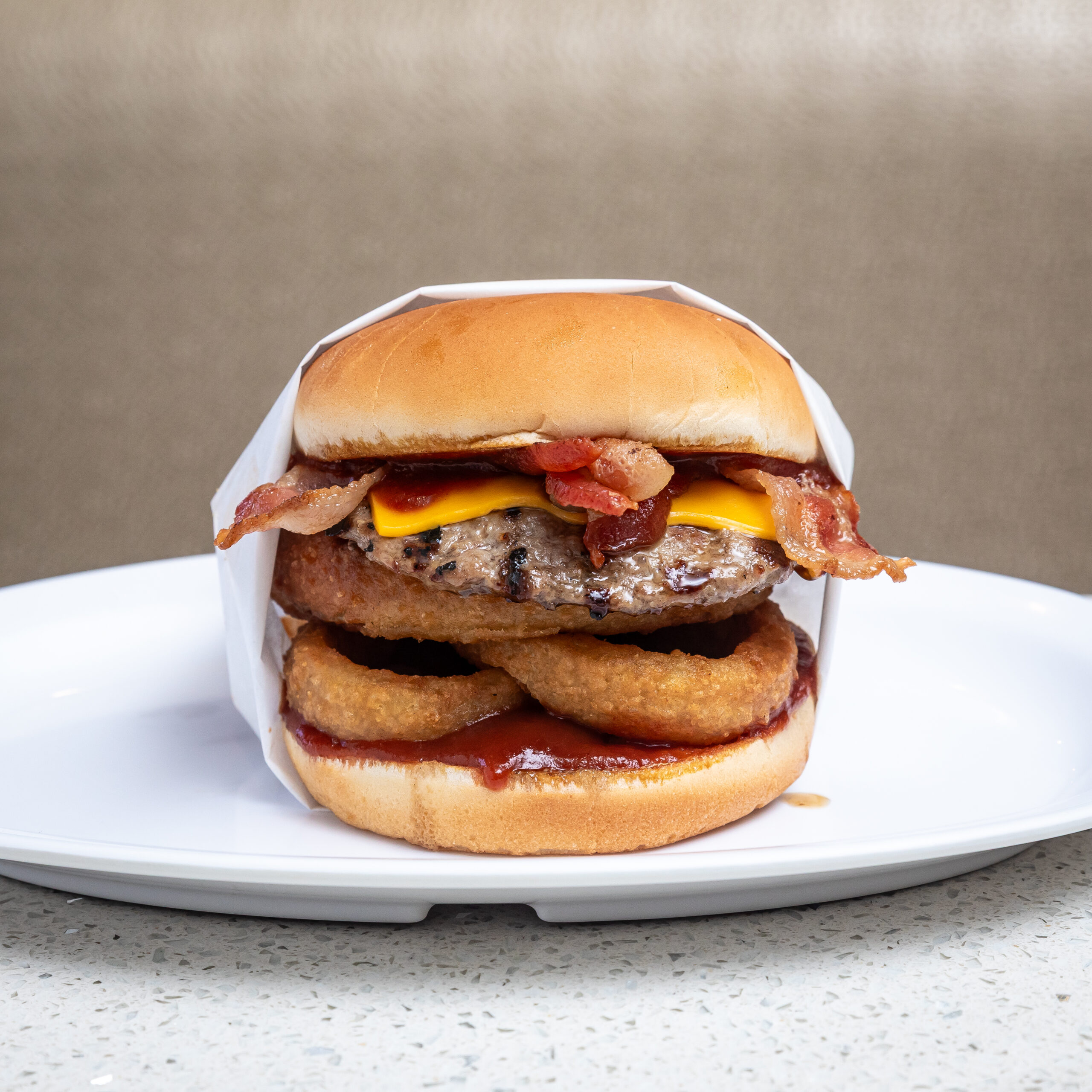 1/3 lb patty on top of onion rings, bacon with BBQ sauce