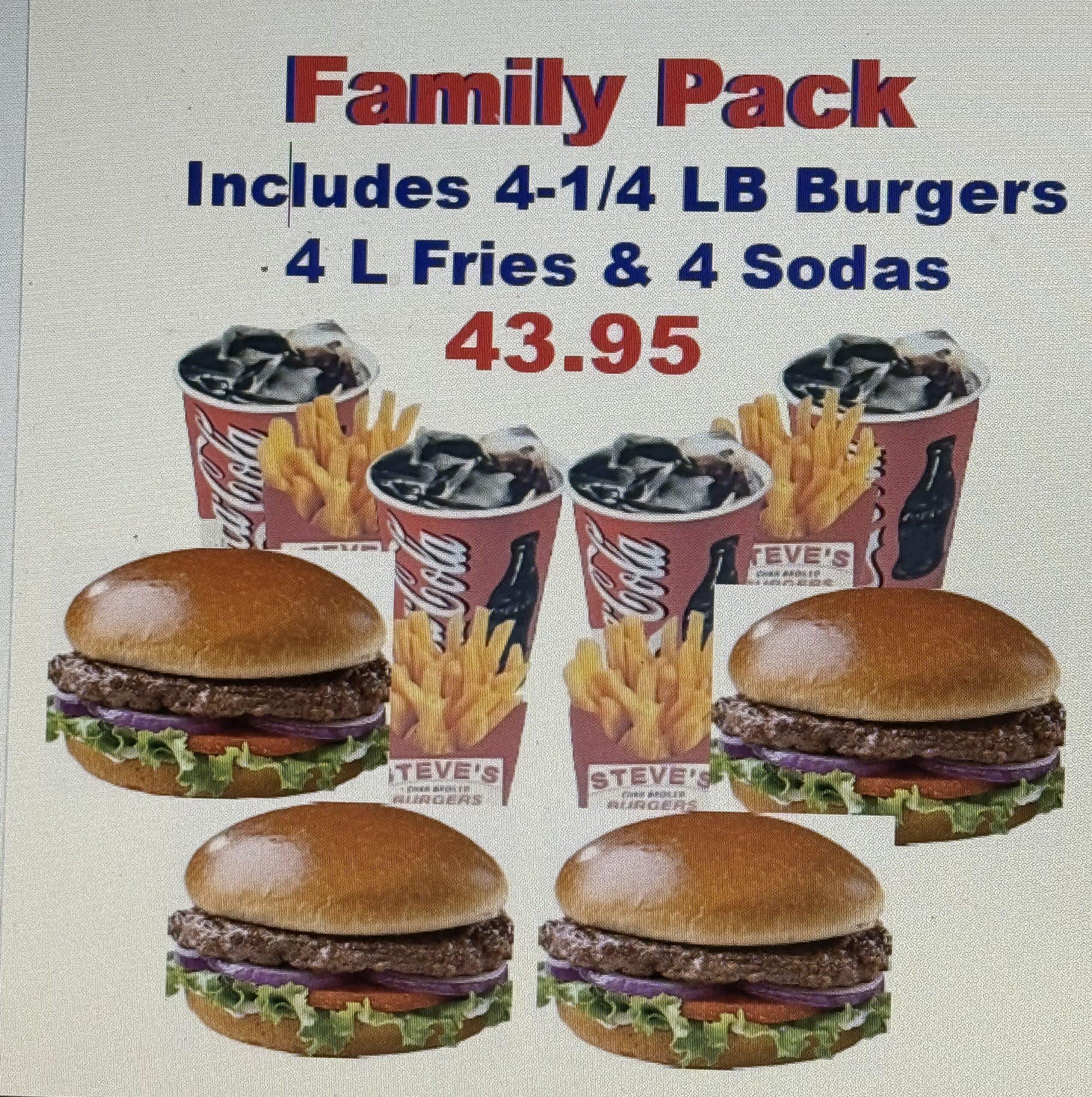 Includes: 4 – 1/4 lb. Burgers, 4 Large French Fries and 4 Medium Soft drinks