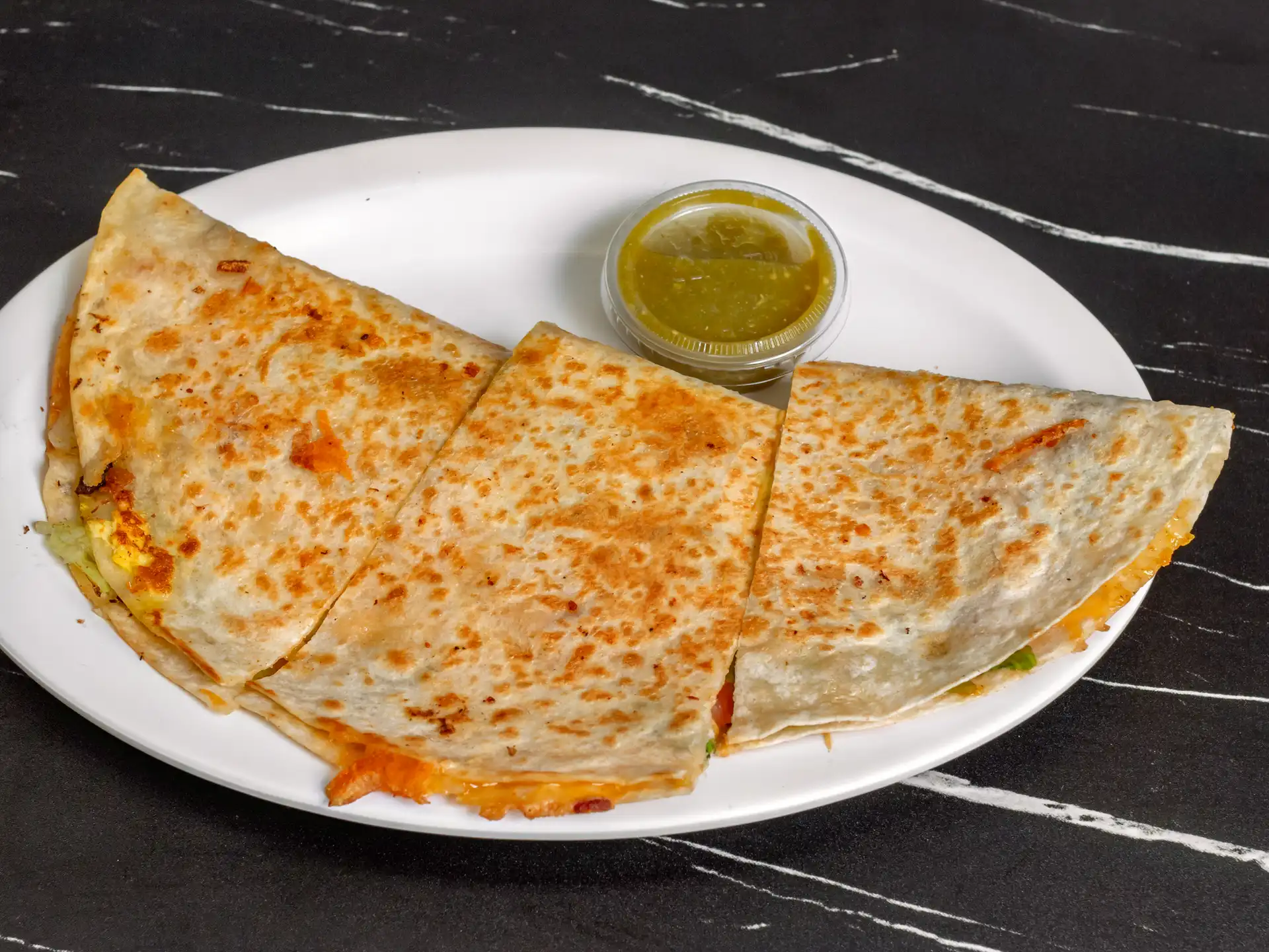 Chicken, cheese, lettuce, tomato, guacamole, and salsa.